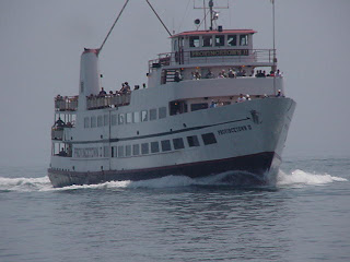 We arrived in Boothbay on Tuesday August 5 after a 27 hour run from Provincetown, Cape Cod MA. There was little wind during the daylight hours but after sunset the wind came up and increased to about 18-20 knots all "on the nose" so we could not sail and the seas were building and very uncomfortable. Between 1 a.m. and 3 a.m we were making very little progress. In fact a wave hit us from behind and threw me from my bunk to the floor ( I did not have the lee cloth attached). I have a nice bruise on the left hip after I graced the floorboards. We headed east toward Portland and the seas calmed and wind lessened so we continued on to Boothbay. We have been playing tourist in town, visiting the shops along the wharf but it has been rainy and cold for the past few days. Today, the sun finally came out!! We grabbed the free trolley and restocked the boat.